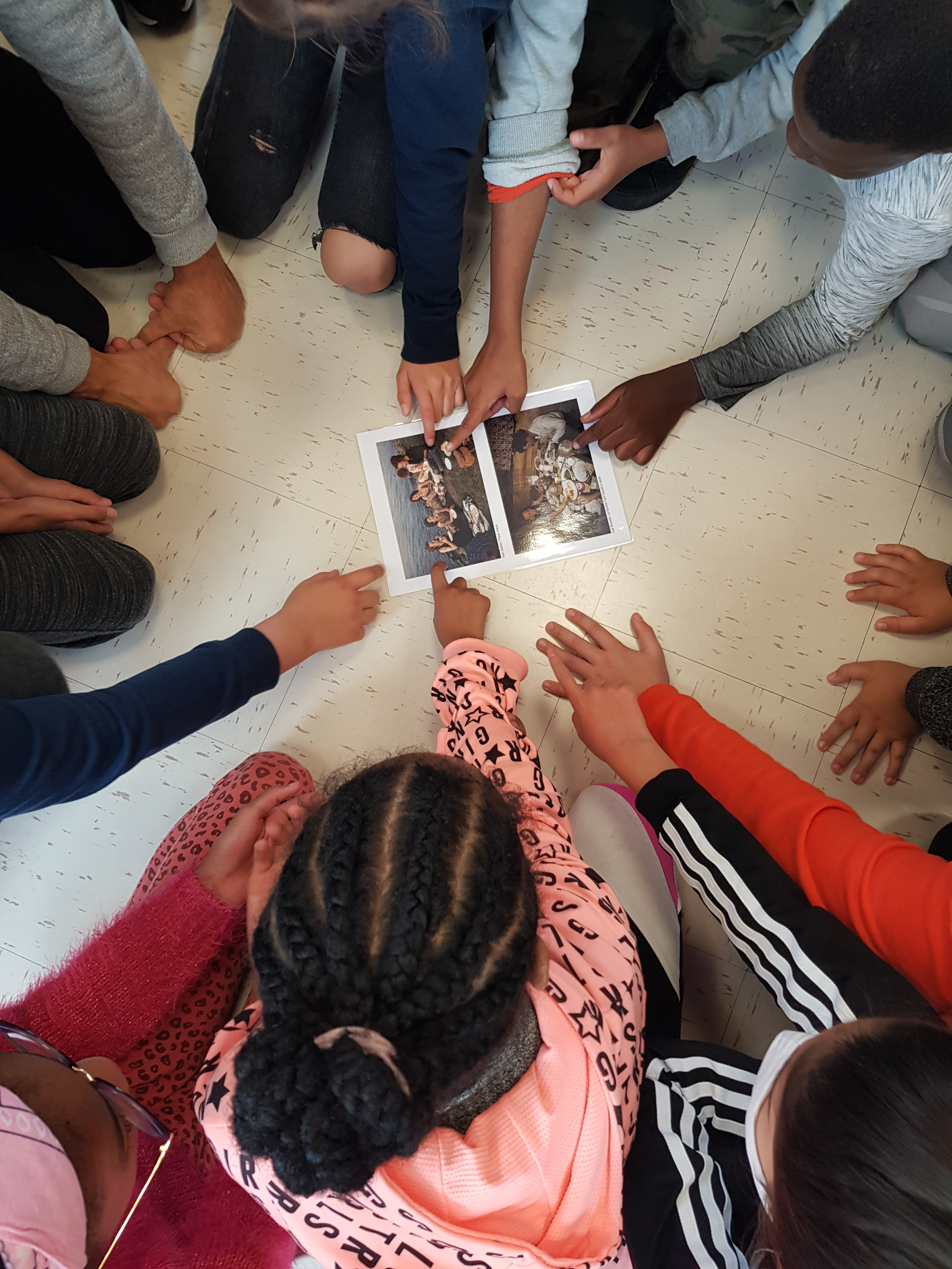 Après une première séance de présentation et de rencontre avec les photographes, un atelier de mise en scène est proposé aux élèves. Les photographes montrent aux élèves des références de l’histoire de l’art et de la photographie sous la forme d’images. Toutes les images représentent des groupes de personnes au moment du repas et c’est à partir de celles-ci que les élèves, par petits groupes, réalisent des mises en scène.