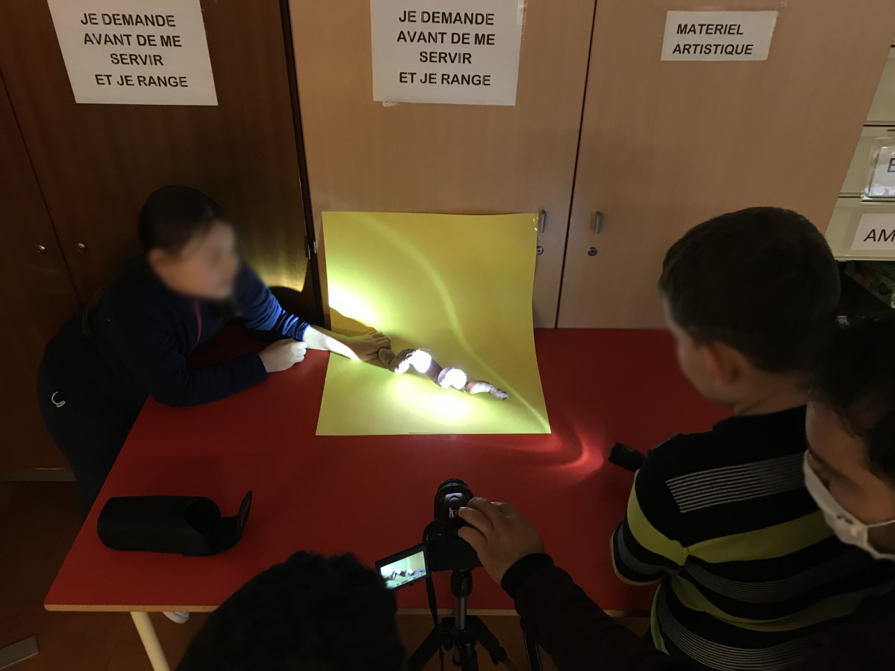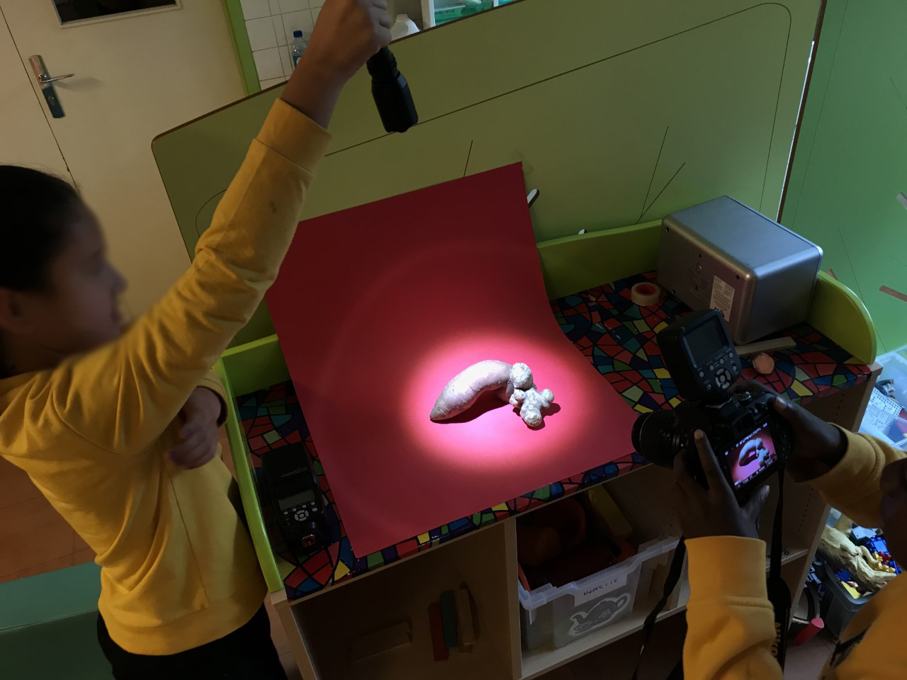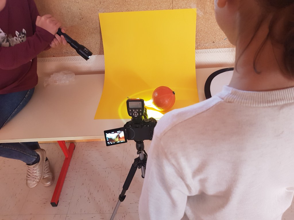 Ensuite, ils leur font découvrir du nouveau matériel photographique (éclairage, filtre macro, flashs, réflecteur…) et ils montrent aux élèves comment installer un studio photographique. Une fois le studio prêt, tour à tour les participants à l’atelier photographient les clémentines, les potirons, les bananes, etc. Il se familiarisent petit à petit avec le langage photographique et le nouveau matériel. La prise de vue en studio est un travail minutieux qui demande à l’élève de l’attention et de la précision.