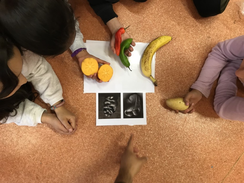 Pour cette séance, la consigne donnée était celle d’arriver en classe avec de la nourriture non préparée et non liquide. Chaque élève a apporté un ou plusieurs aliments, dont de nombreux fruits et légumes, qui ont été mis en scène et photographiés.