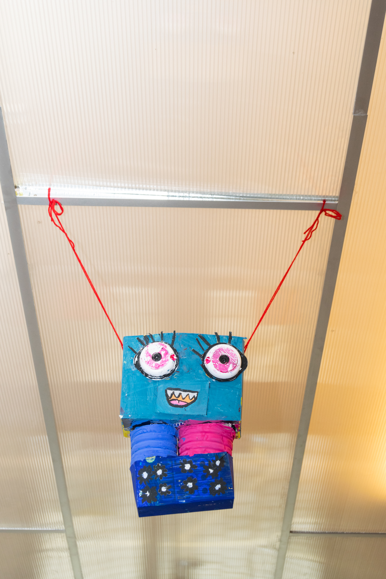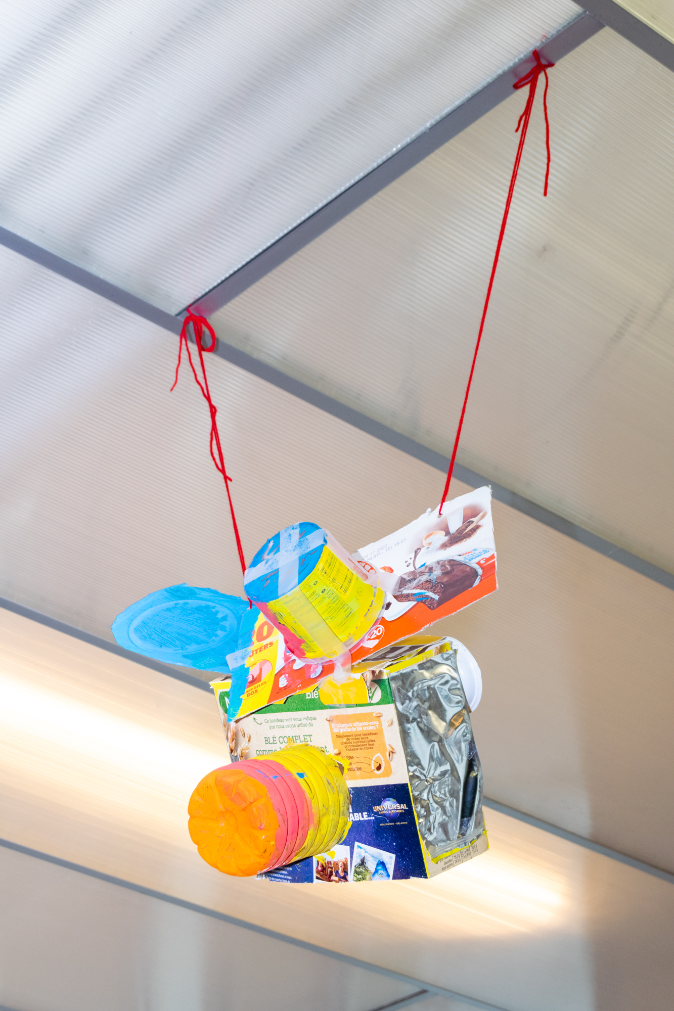 Pour valoriser ce travail plastique, les élèves ont réalisé un accrochage de leurs œuvres au plafond. Ainsi, les sculptures de ces personnages inattendus occupent l’espace et la matière recyclée prend vie.