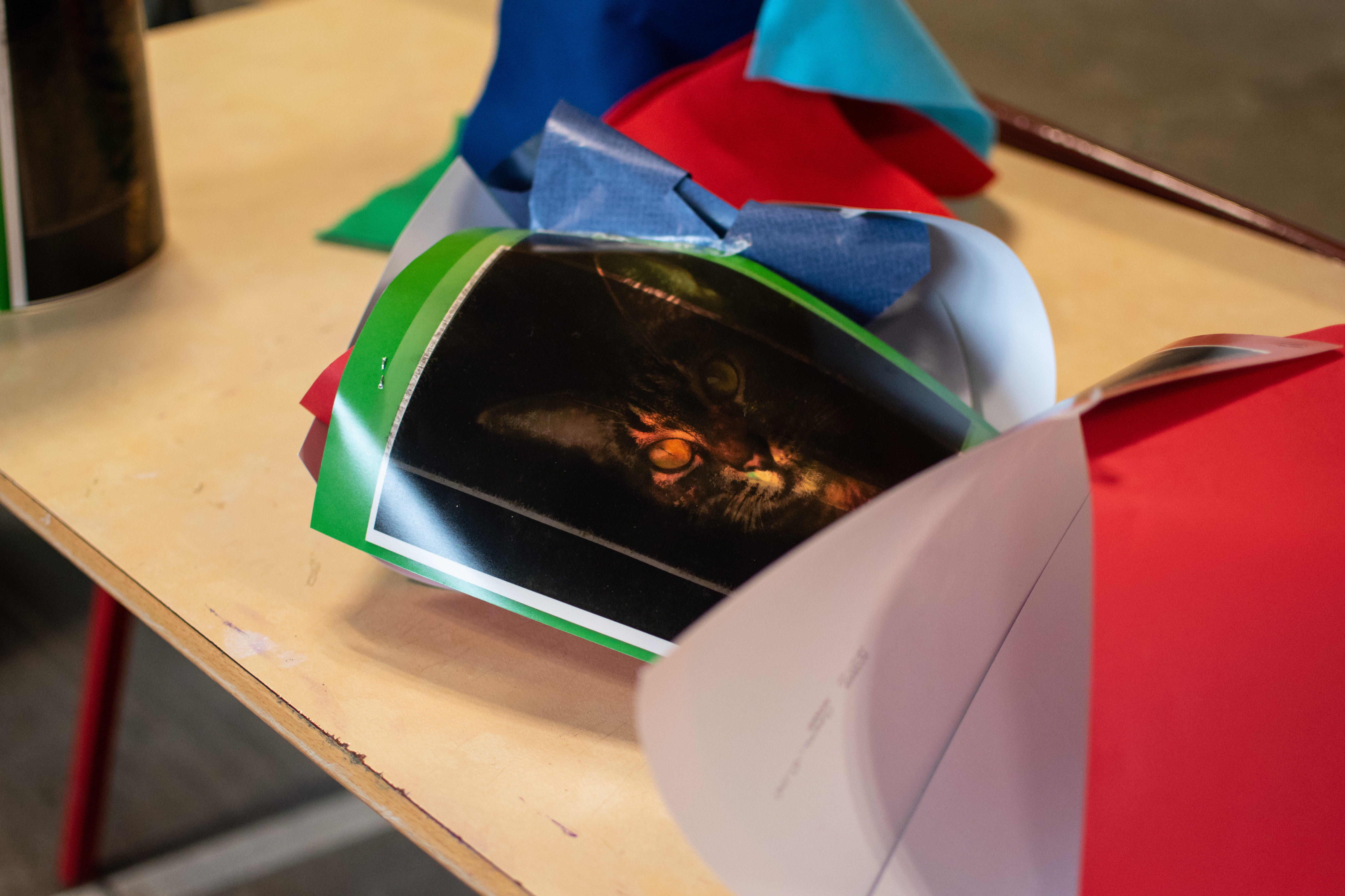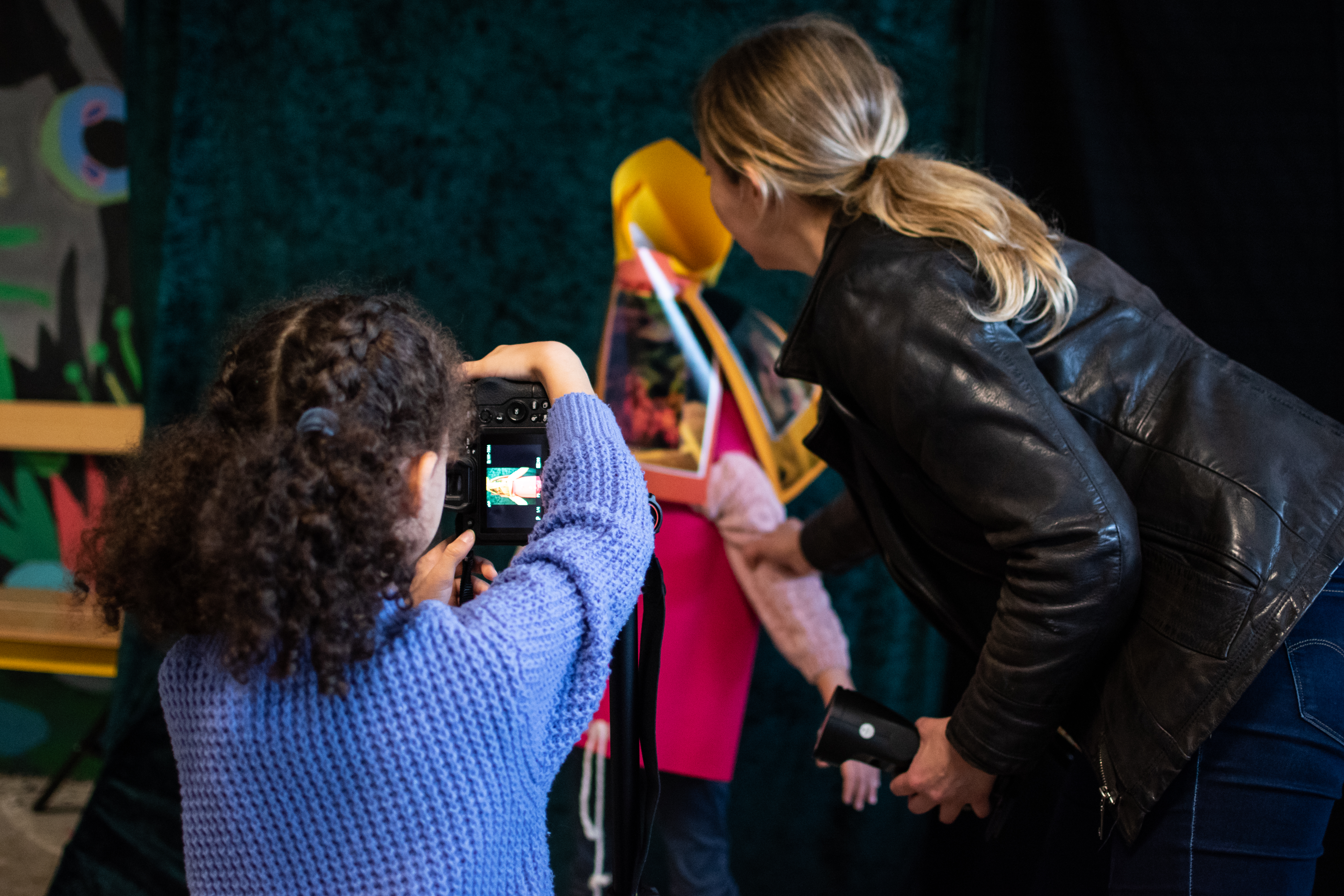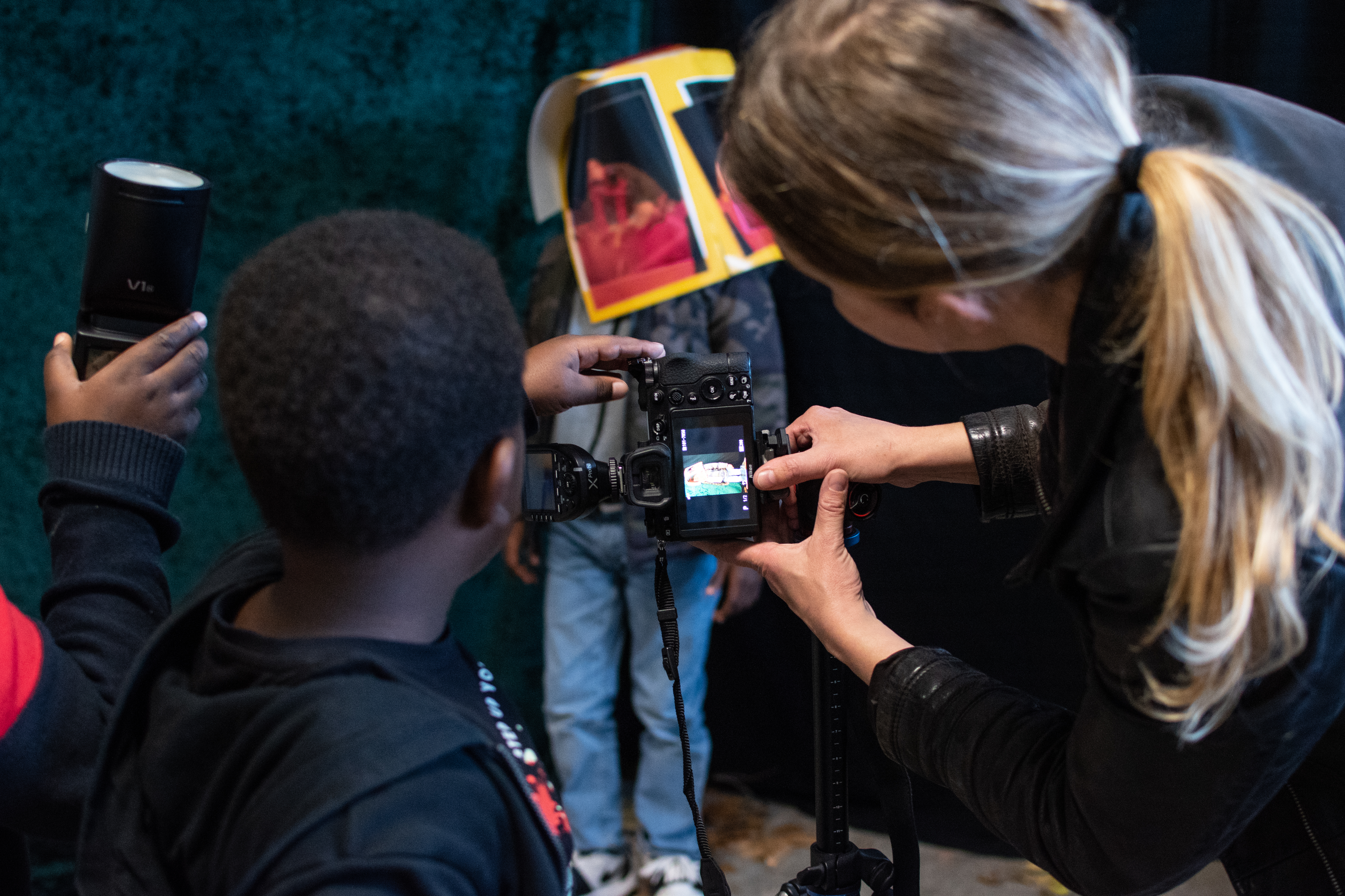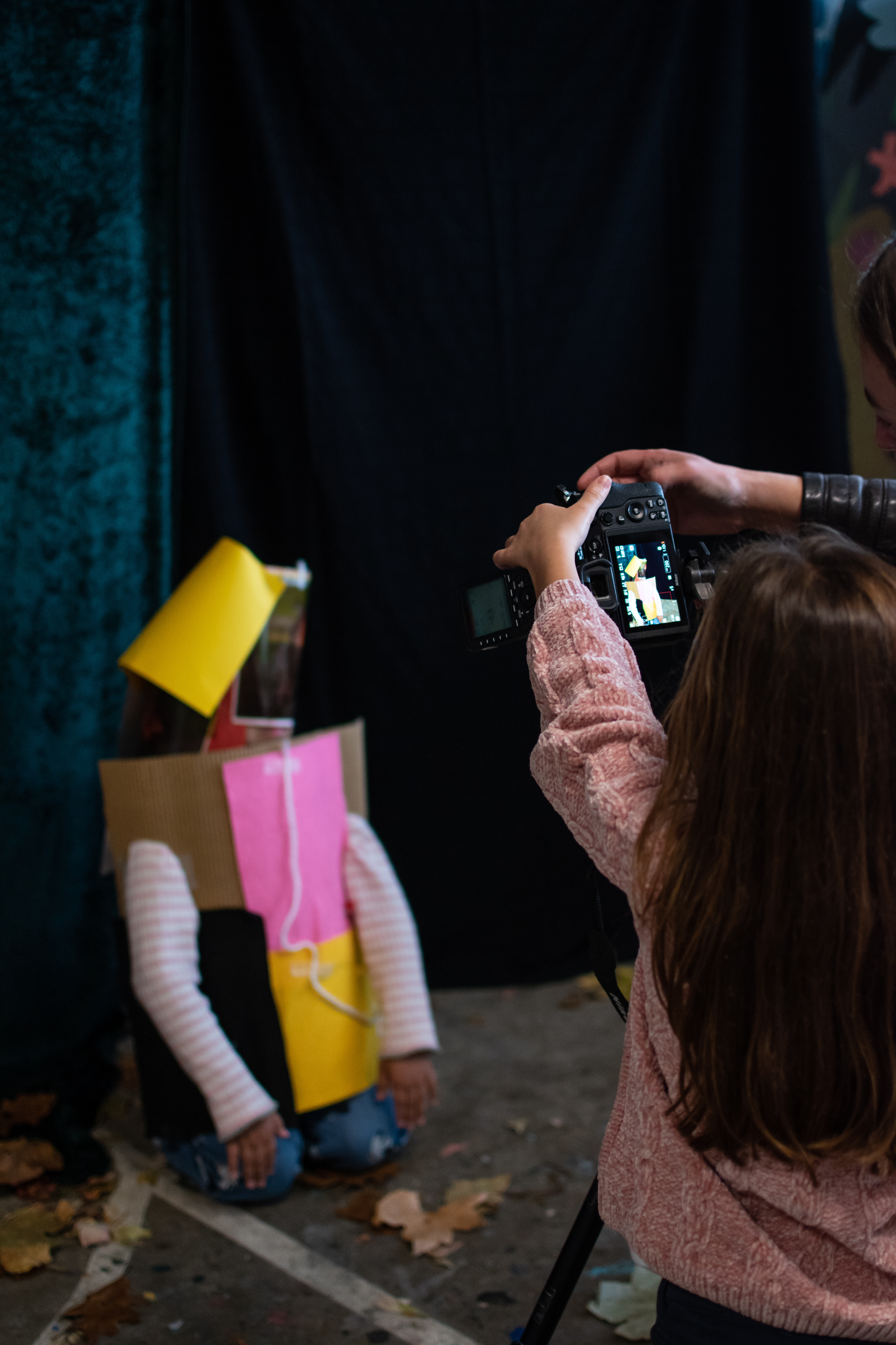 Une fois le set photographique installé, c’est aux enfants de poser et de s’exprimer devant l’objectif. Mais réaliser les prises de vue est aussi leur tâche : grâce à l’aide précieuse de Laure, les jeunes apprenti·e·s photographes réalisent des portraits de leurs camarades, l’un·e en tant que photographe, l’autre comme assitant·e lumière, car nous avons appris que l’utilisation du flash est indispensable pour obtenir un bon résultat photographique !