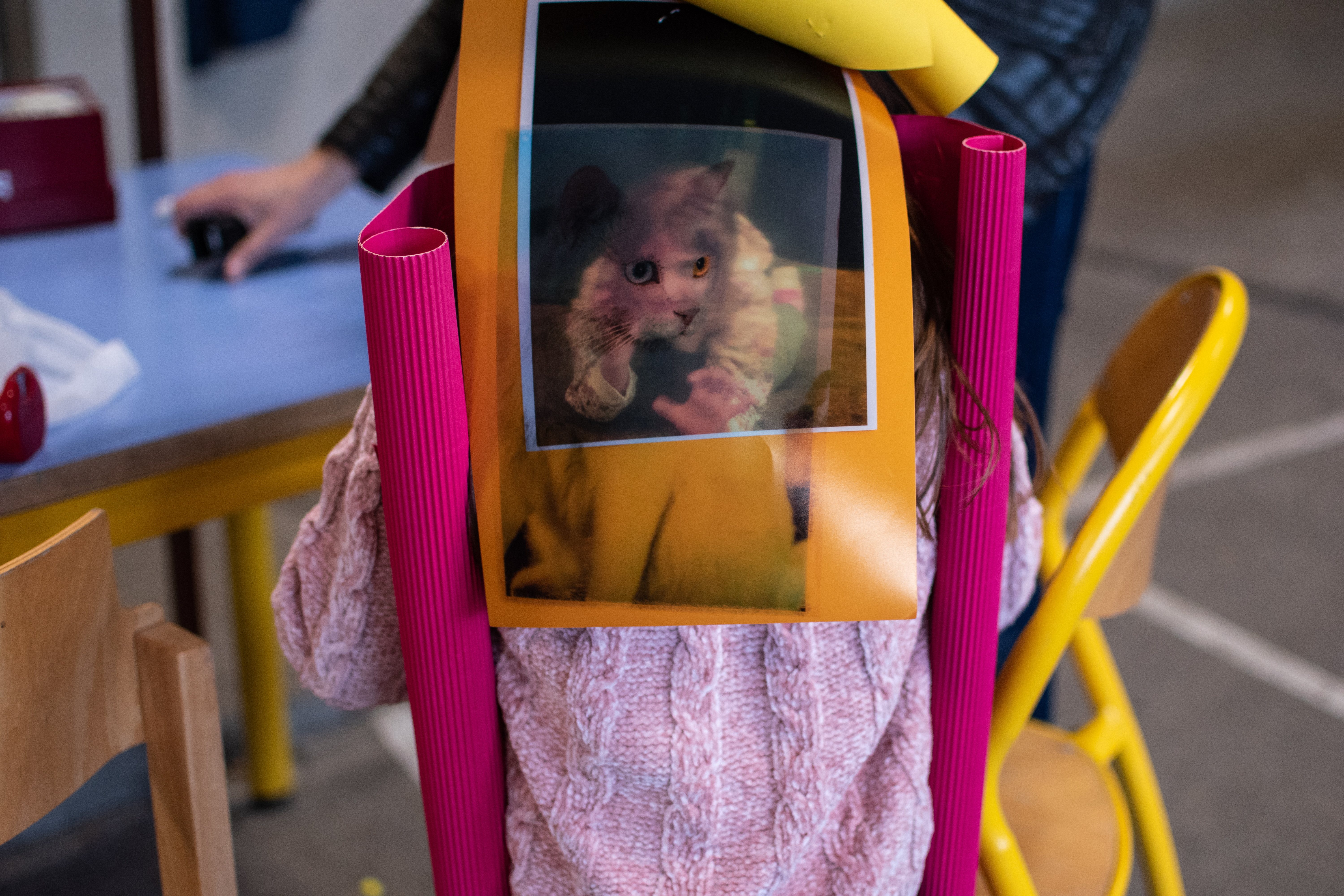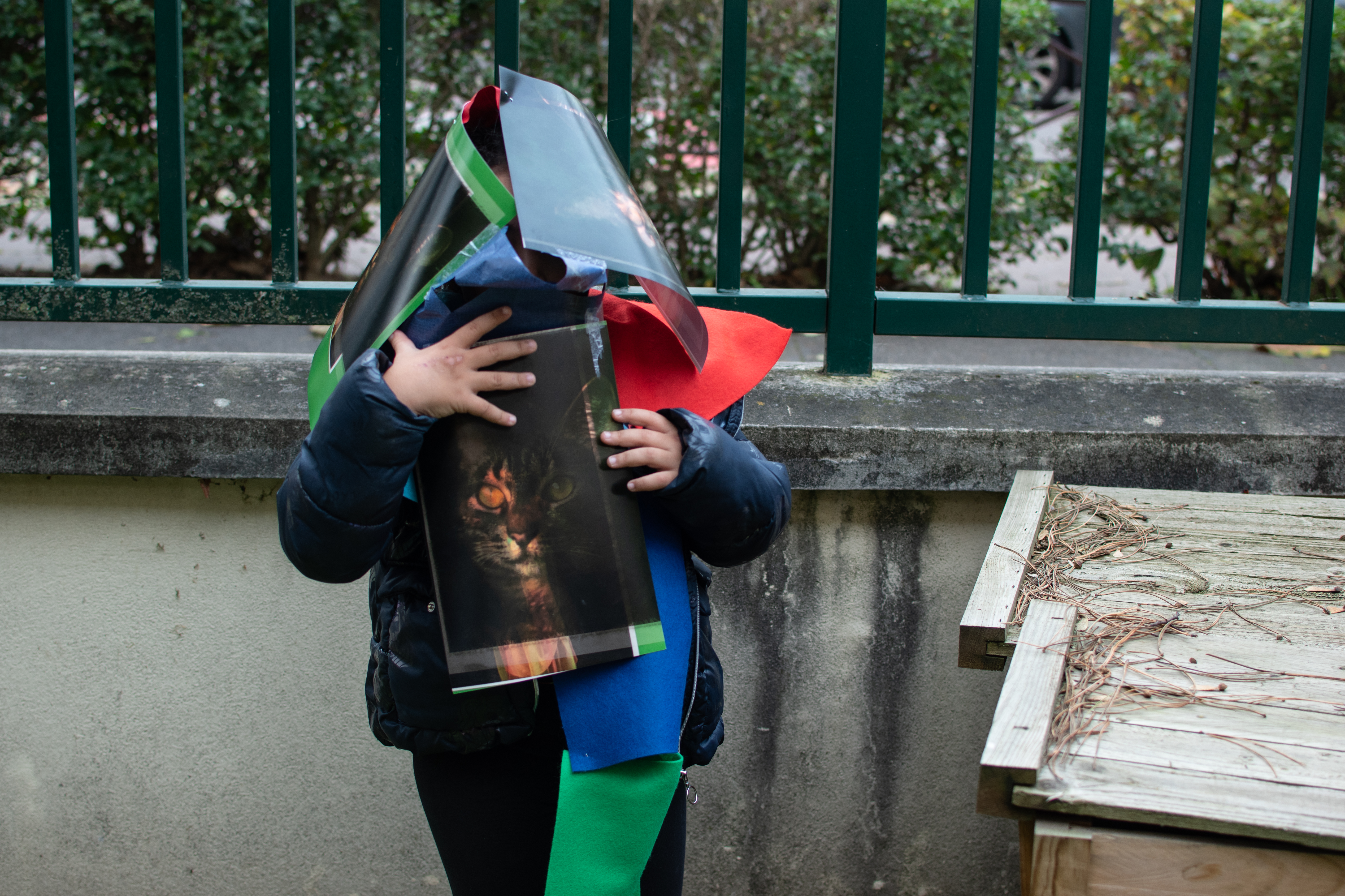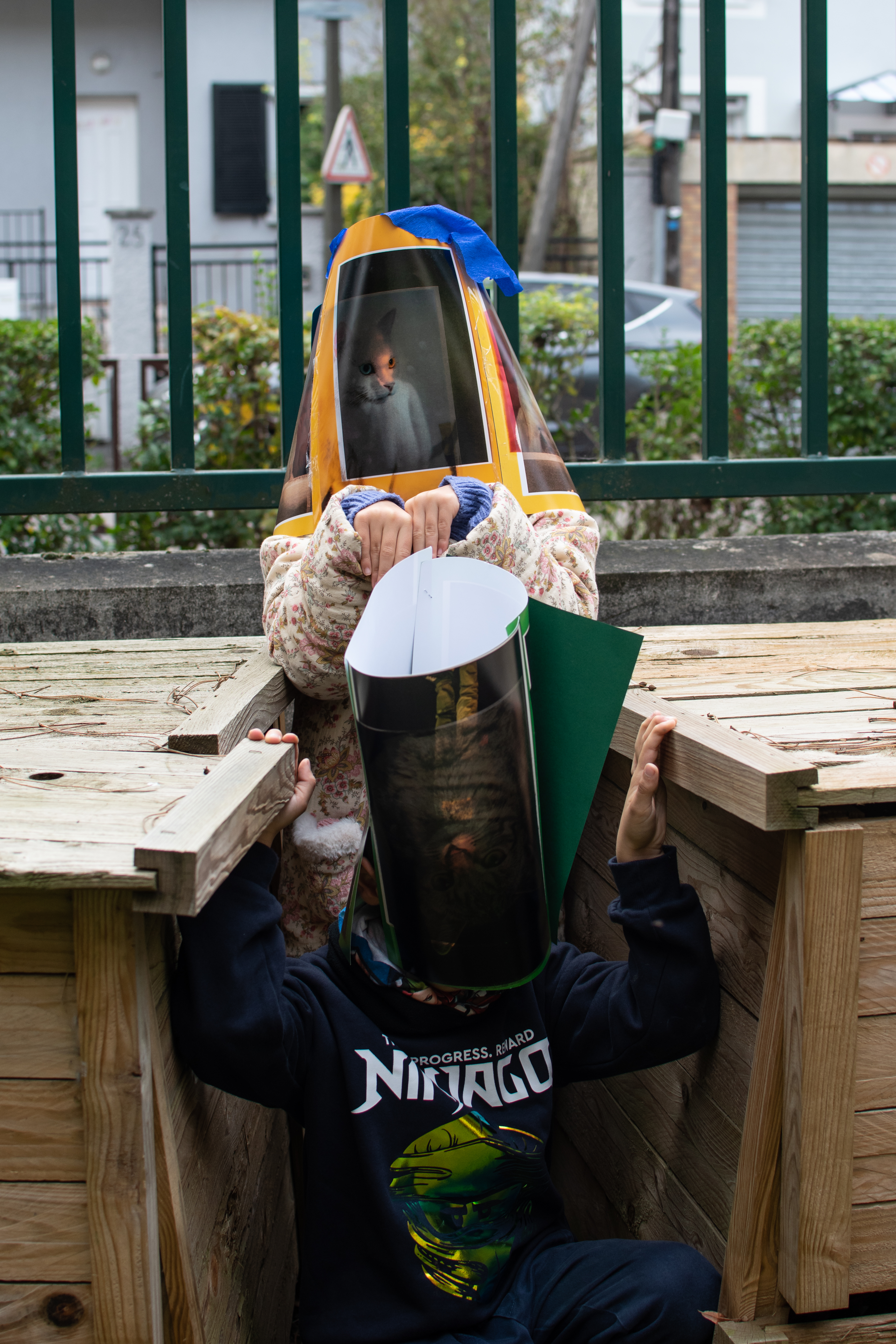 Humain et animal se fusionnent à travers la photographie et les arts plastiques au sein des séances suivies par Laure Pubert dans l’École élémentaire Irène Joliot-Curie à Villejuif. L’objectif de cet atelier est en effet de créer un monde surréaliste, à travers un travail de métamorphose réalisé grâce au potentiel créatif de la prise de vue et de la manipulation plasticienne du tirage photographique. Les enfants donnent vie à leur animal totem, hybride et chargé de sens symbolique : il devient le protecteur de l’enfant, qui prend conscience de son importance et de sa portée créative pour enchanter le réel.