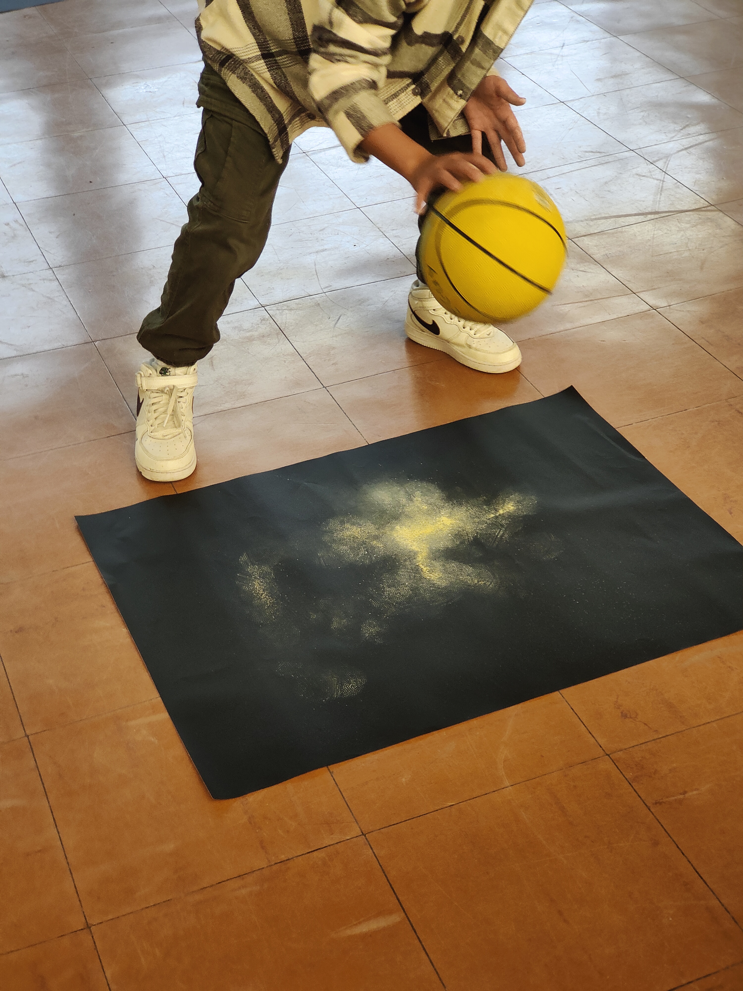 Dans un deuxième temps et à l’aide de la craie, les élèves se sont servi·e·s de ballons pour saisir les traces de leur mouvement et leur rebondissement sur du papier. Encore une fois, le matériel a été détourné, cette fois agissant comme outil de dessin ! Cliquez sur la vidéo ci-dessous pour découvrir le processus :